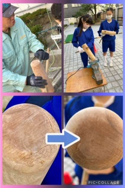 今日は、職場体験の2日目でした。まずは、12月の餅つき大会で使うきねの研磨作業をしました。私は、きねを一度買ったらそのままずっと使っていると思っていたので、このような作業があることに驚きました。均等につるつるにしていくのは難しかったです。管理作業員さんが仕上げをしてくださいましたが、とてもきれいで驚きました