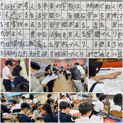 5年2組では、総合的読解力育成カリキュラム「未来の学校を考えよう」の学習の5時間目を行いました。ミッションは、「未来の学校では、どんな場所で過ごしているのだろうか」。