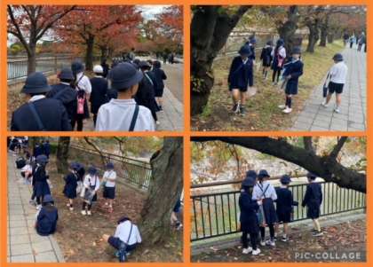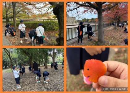 赤・茶・黄色、色鮮やかな落ち葉やどんぐりを袋いっぱい拾ってきました。これを使ってかんむりを作る予定です。出来上がりをお楽しみに!