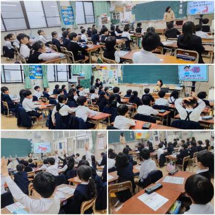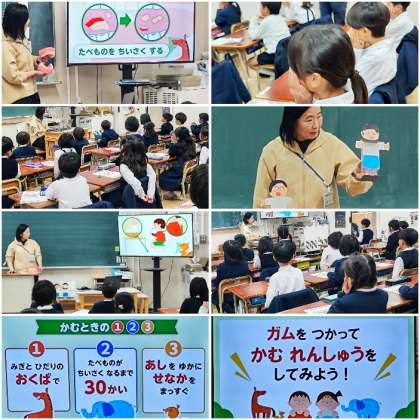 1年生にもよくわかる動画や人形の小道具を使って、クラスごとに養護教諭が指導しました。今日は給食でうずら卵が出ます。早速今日の学習が活かせそうですね。