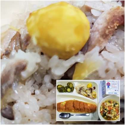 今日の給食では、焼き豚・くり・しいたけ、が入った「中華おこわ」にしています。