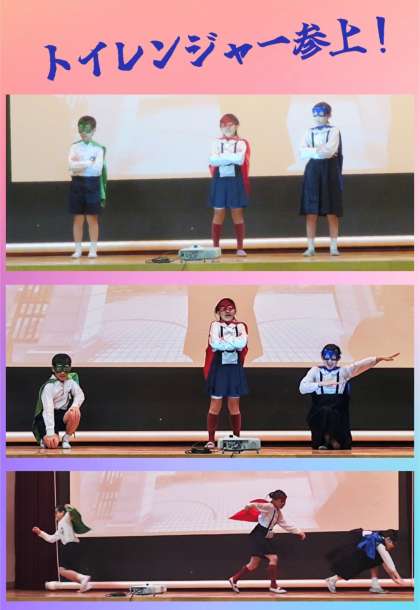 ◇〔トイレの神様〕にかわり、〔トイレンジャー〕が生魂小学校に登場。後から利用する人のことを考えて使ったり、スリッパを並べたりしようと呼びかけました。