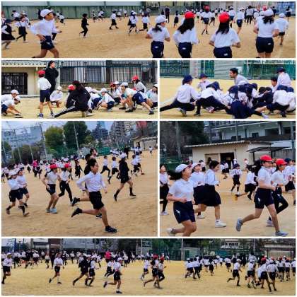 写真は、2・4・6年生のかけ足と、1年生のなわとびの様子です。