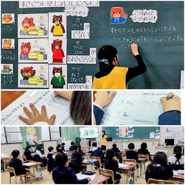 今日は、それぞれの食べ物に大切な役割があることを勉強し、児童が好き嫌いをせずに何でも食べることにより、より健康な生活を過ごすことができることを学習していきました。