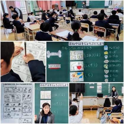 味原小学校の栄養教諭の先生が来校くださり、「ほねや はを じょうぶにしよう」をテーマにカルシウムが、骨や歯をつくる大切な栄養であることを学習しました。