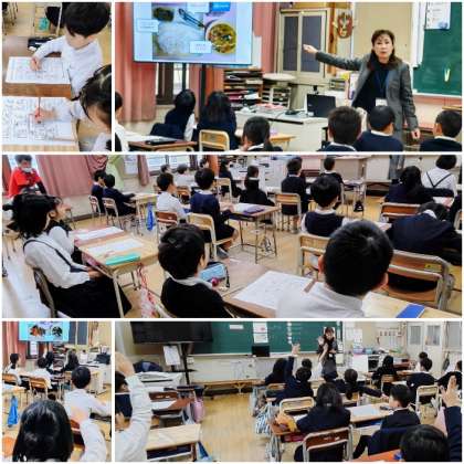 本校では、各学年の成長に合った栄養についての授業を通じて、児童が食べることに興味関心を持つきっかけとし、バランスの良い食事をとることによって、より健康な生活を過ごすことができることを6年間で学習していきます。