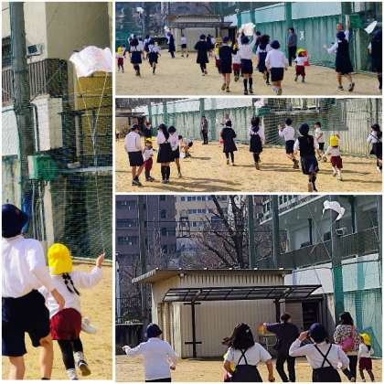 園児さんが作った可愛い凧を、一生懸命に腕を伸ばして、できるだけ高くなるように揚げようとしている様子は、園児さんを喜ばせてあげたい、という思いやりの姿であふれていました。