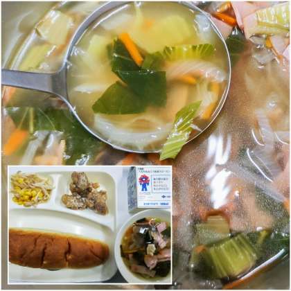 今日の給食では、「ハムとやさいのちゅうかスープ」に使われています。