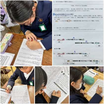 最後に「主語+AとB+述語」、「主語+A+述語。また、B+述語」、主語を入れ替える読みかえ、という要約の文型を振り返り、確認プリントで定着を図りました。