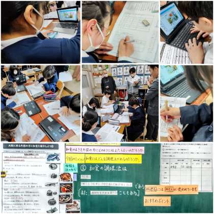 児童の食の経験は様々ですが、既習の事柄や資料を基にしながら自分の経験を結び付け、それを交流によってより確かな知識として関連付けていくことで、深い学びになっていました。これから郷土料理へと発展させ、より学びを深めていきます。