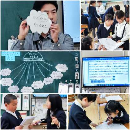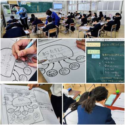 後半は、思考ツールのクラゲチャートを使って自分たちにできることを考えていきました。行動面と気持ちの面に整理して、最後に作者が何を伝えたかったのかを振り返ることで学習を深めていきました。
