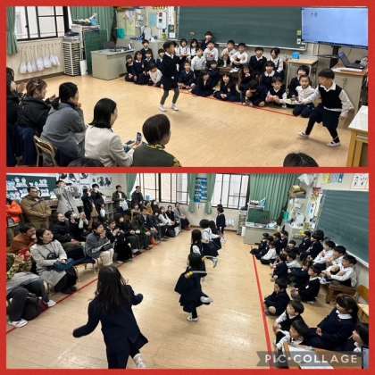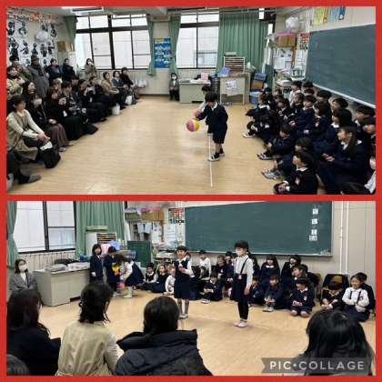 グループごとに、なわとび、手話、こままわしなど、できるようになったことを発表したり、みんなで♪校歌や♪これからもともだちを歌ったりしました。
