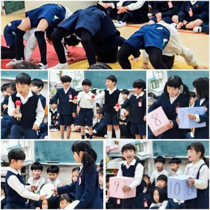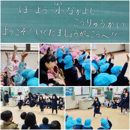 1年生は、1年間でできるようになったこと(かんじ・けいさん・しゅわ・おてだま・こま・マットうんどう・なわとび・けんだま)をグループに分かれて発表したり、いくたま小学校の紹介をしたりしました。