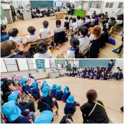 本日の2限目は、「生魂幼稚園」「四天王寺夕陽丘保育所」「うえしおキンダースクール」「たにまちナーサリー」の年長組との交流会でした。