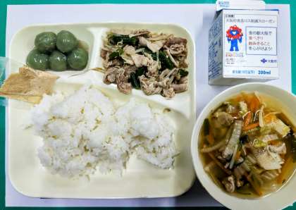 給食の「よもぎだんご」は、うるち米、もち米、よもぎから作られています。うるち米とは、普段ご飯として食べているお米のことです。