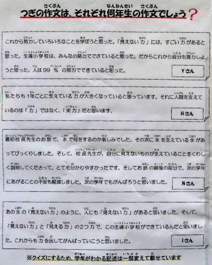 冒頭の質問の答えは、全て2年生の作文です。どうですか?しっかりと話を聴いて、よく書けていますよね。