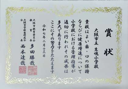 今年度、本校が、歯と口の保持並びに健康増進について小学校における管理指導が適切に行われており、その成果が多大であるということで、大阪市教育委員会教育長と大阪市学校歯科医会会長の名で表彰を受けました!