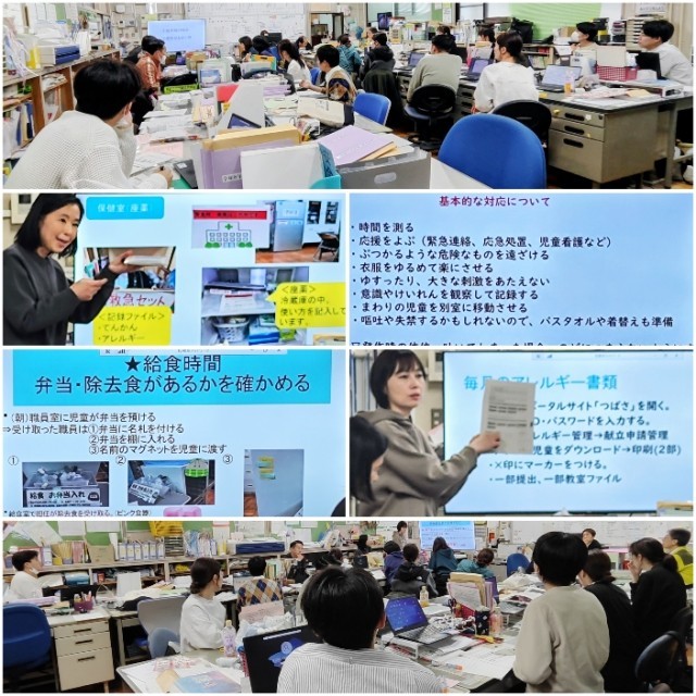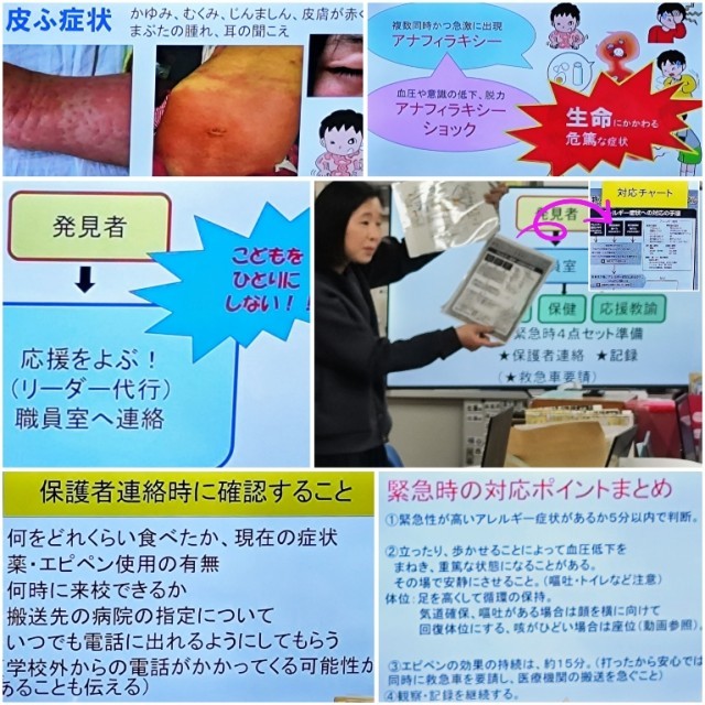 入学式の日の午後からは、食物アレルギーや発作、ショック状態など、市の方針が変わった点や教職員が理解しておかないといけない事項について研修を行いました。