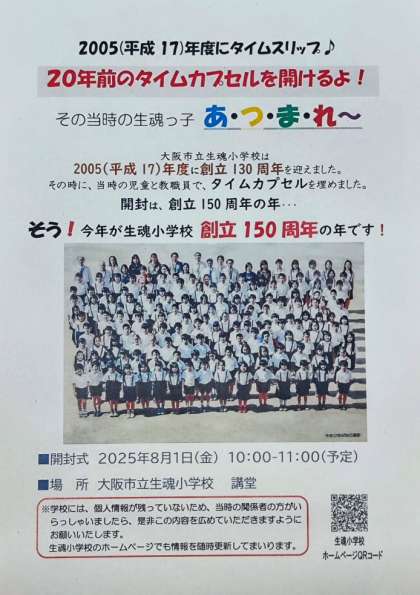 当時の生魂小学校関係者の皆様は、現在の住所や電話番号などの個人情報が判らないため、是非、口コミでの周知をお願いします。詳細は、後日お知らせいたします。