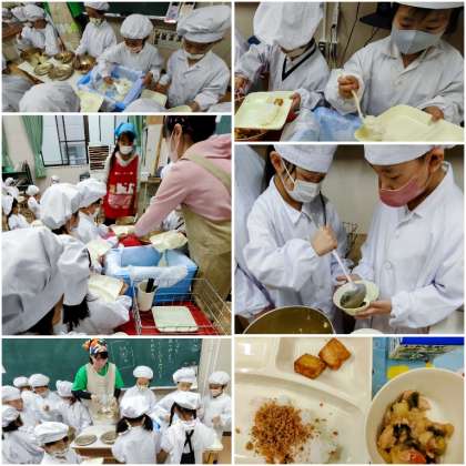 ●給食室においている見本を見て、ひとり分をきれいにもりつけましょう