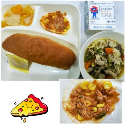 給食の「変わりピザ」 は、ぎょうざの皮に、新食品の「牛乳なしチーズ」とツナ・コーン・ピーマン・ピザソースを混ぜ合わせた具をのせ、焼き物機で焼いて作っています。