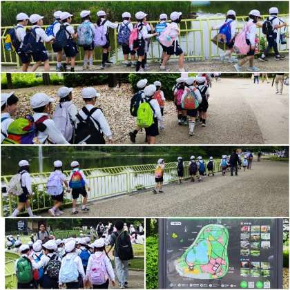 自然史博物館で学級ごとに記念写真を撮ったら、いよいよお弁当です。