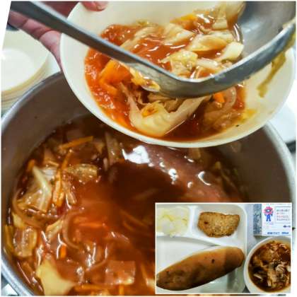 今日の給食の「ミネストローネ」には、鶏肉とキャベツ、たまねぎ、にんじん、トマトなどの野菜が使われています。