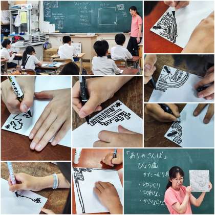 3年の図工では、フェルトペンの特徴を体感しながら「ありのさんぽ」を楽しみ、考えながら書き方を工夫していました。