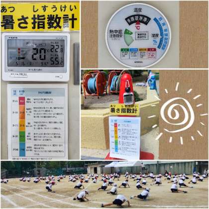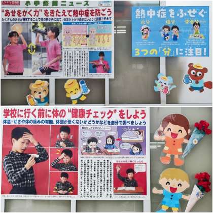 保健室の前では、写真のような熱中症への注意を呼び掛ける掲示をしています。