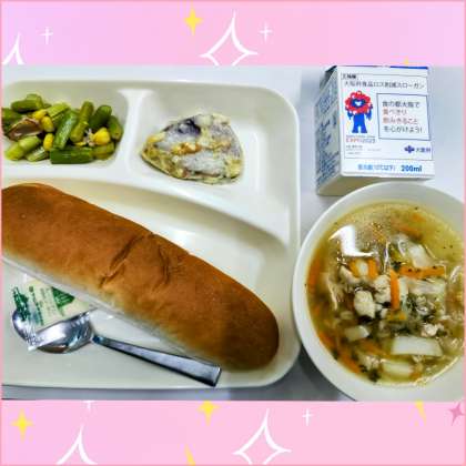 給食では、「かわちばんかん」「えんどう(グリンピース)」「たけのこ」「レタス」「グリーンアスパラガス」「わかめ」が旬の食べ物として出ました。