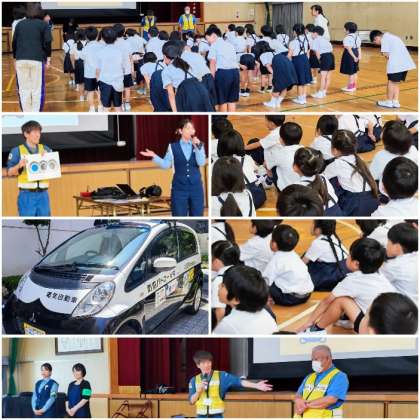 区役所の安全パトロール隊の方から、交通事故にあわないようにするにはどんなことに注意すればよいか、という「交通安全」について、天王寺警察署の方から、悪い人に、連れていかれないようにするにはどうすればよいか、という「外で安全にすごすための5つの約束」について教えていただきました。
