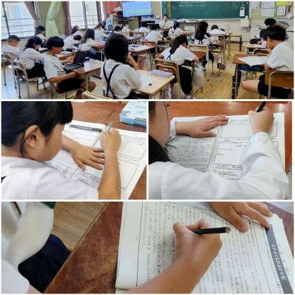 前半は教材を読んで、世界の友だちと付き合うために必要な、「想像力」と「粘り強さ」についてまとめていきました。