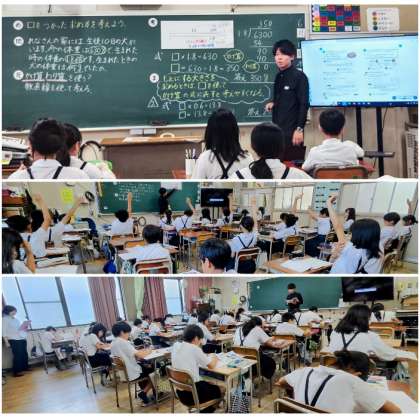 2時限目は、本校の子どもたちの学力の定着と向上をめざすため、大阪市総合教育センターからスクールアドバイザーの大野 節子先生をお招きして、5年2組の教室で算数の「小数の倍」の授業を見ていただきました。