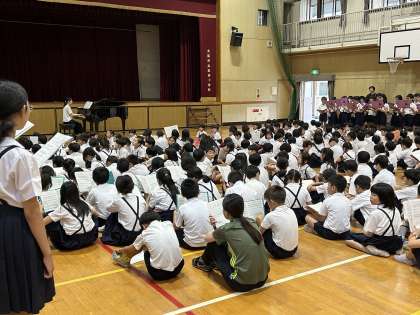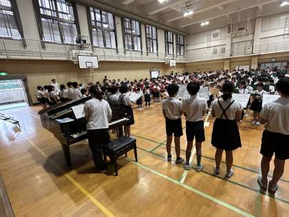 はじめに、少しずつ練習していた5・6年生がお手本として歌い、続いて1〜4年生が合流し、一緒に練習するという流れで行いました。