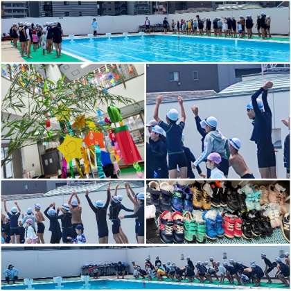 5年生と生魂幼稚園のそら組(年長組)さんとの交流プールです。