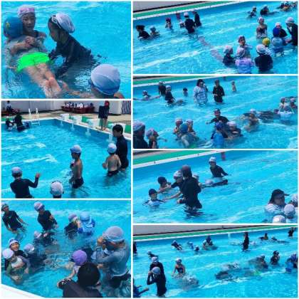 交流プールでは、みんなで「いくたま忍者」になって楽しみました。「いくたま忍者!ニンニン」の合図で修行開始!