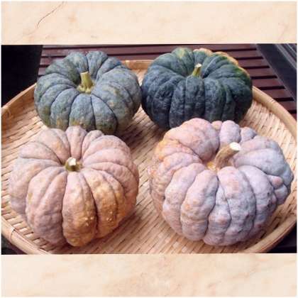 なにわの伝統野菜には、大阪市西成区玉出町(旧 勝間村)で生まれた「勝間南瓜(こつまなんきん)」があります。写真の右が縮緬(ちりめん)かぼちゃの「勝間南瓜(こつまなんきん)」です。