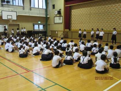 今日の児童集会で、新旧代表委員があいさつをしました。前期代表委員は、さまざまな取り組みの中で成長したことを伝えてくれました。
