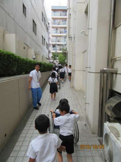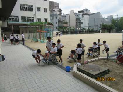 大阪市立心身障がい者リハビリテーションセンターの方に来ていただき、車いすの適切な操作や介助方法を学習しました。この体験を通して、車いすを利用されている方や障がいのある方の気持ちについて考えました。