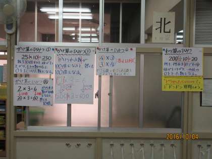 今日は、初めて3つの数のかけ算について考える場面でした。安心してわからない事はわからないと言える、間違うことを恐れずに発表できるあたたかい学級の雰囲気の中、意見を出し合い、練り上げながら学習を進めていました。