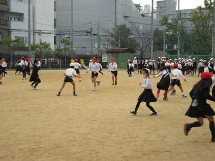 木曜日の始業前は、全校児童集会をたてわり活動でおこなっています。ふだんは、講堂で活動することが多いのですが、今日は運動場で「しっぽとり」ゲームをしました。腰につけたしっぽを相手にとられないように運動場いっぱいに走り回りました。