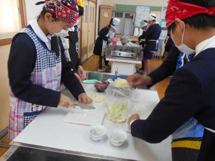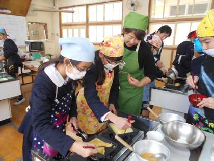 今日は、大阪ガスから講師をお招きして、環境問題との関わりを考えながら、「たまご焼き入りおにぎらず」と「白菜の即席漬け」作りに挑戦しました。