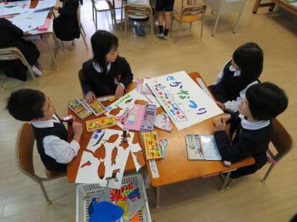 生魂フェスティバルと並行して、1年生は、来週の保育所・幼稚園のお友だちとの交流会にむけて準備を進めています。がんばれ、1年生!