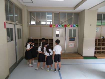 2年生が、学校中を案内しながら、教室の名前やどんな学習をしてどんな物が置いてあるかなどを1年生に説明しました。