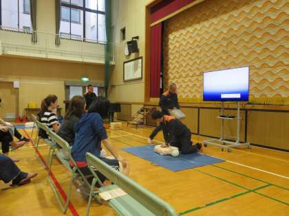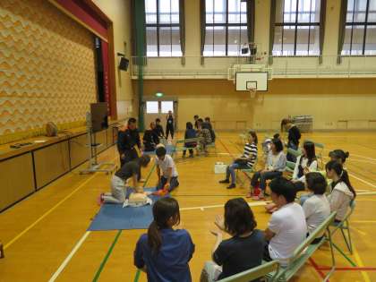 天王寺消防署の救急隊の皆様より、応急手当の重要性と心肺蘇生の手順を教えていただきました。