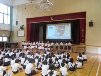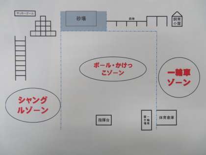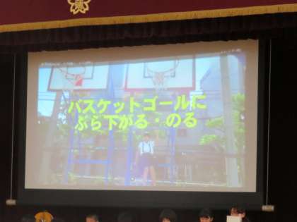 みんなが安全に楽しく運動場で遊ぶために、運動委員会が「やってはいけないこと」や「遊びの場所」などについて説明してくれました。