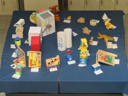 3年生の夏休み工作作品を、19日(火)まで職員室前に展示してあります。