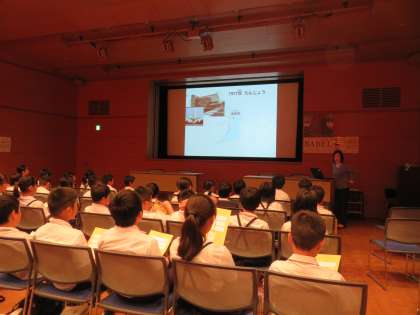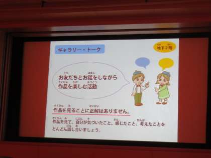 午後は、科学館の向かいにある国立国際美術館を見学しました。写真は、作品鑑賞前のオリエンテーションの様子です。話題の「バベルの塔展」開催中ということもあり、大勢の人でにぎわっていましたが、子ども達はそれぞれお気に入りの作品に出会うことができたようです。