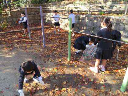 大阪マラソンクリーンUP作戦として、たてわり班で公園清掃を実施しました。いつも利用している上汐公園や上七公園をきれいにしようと、どの子も一生懸命にゴミを拾ったり、雑草を抜いたりしていました。
