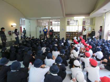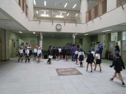 ◇地震がおさまったので講堂へ集合(実際の場合は、雨でも運動場に集合します。)